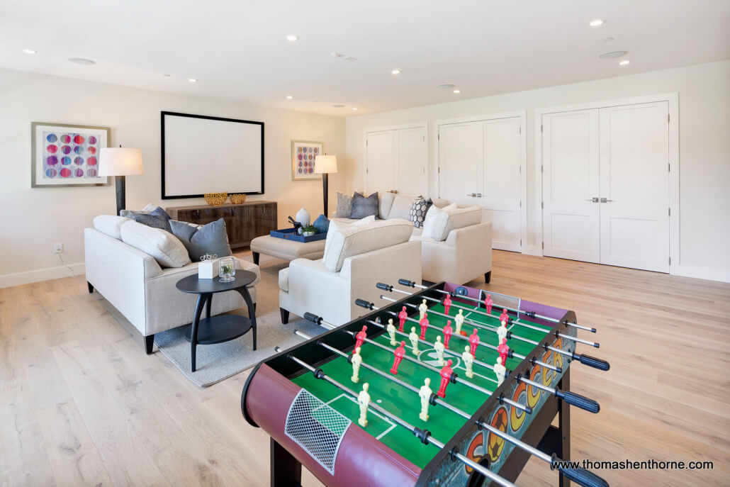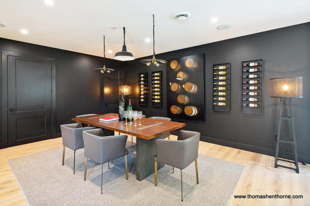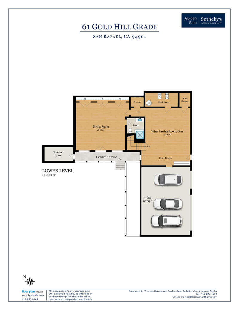 The lower level features a spacious media room that opens out to the lawn area. The media room has been pre-wired for surround sound speakers and ease audio/visual equipment installation. There is also a full bath with beautiful custom tile and high-end finishes. In addition to the media room, this level features a glass enclosed wine lounge that could also be an optional gym. A mud-area with built-in bench and storage is located just inside from the three-car garage.