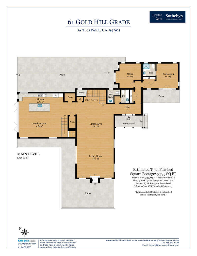 The home’s main level also features a spacious guest suite with a private bath and deck, an office, powder room and a full bath accessed from outside for the pool.