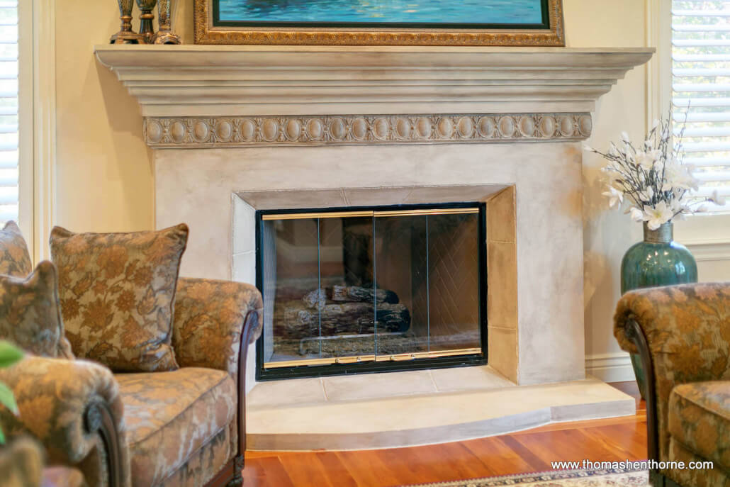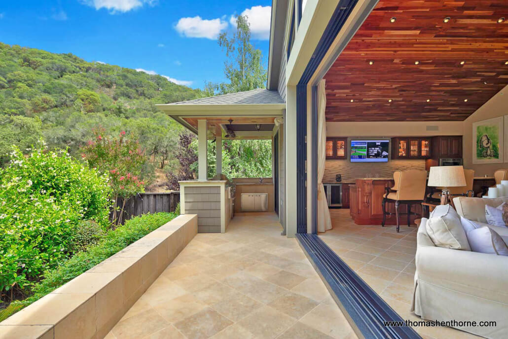 The room features 18.5-foot cherry wood ceilings, thirty-two linear feet of 10-foot high Fleetwood sliding doors, radiant heated floors, two large-screen TVs with surround sound and an artisan limestone custom gas fireplace. There is also a custom Centor screen system for all the large openings.
