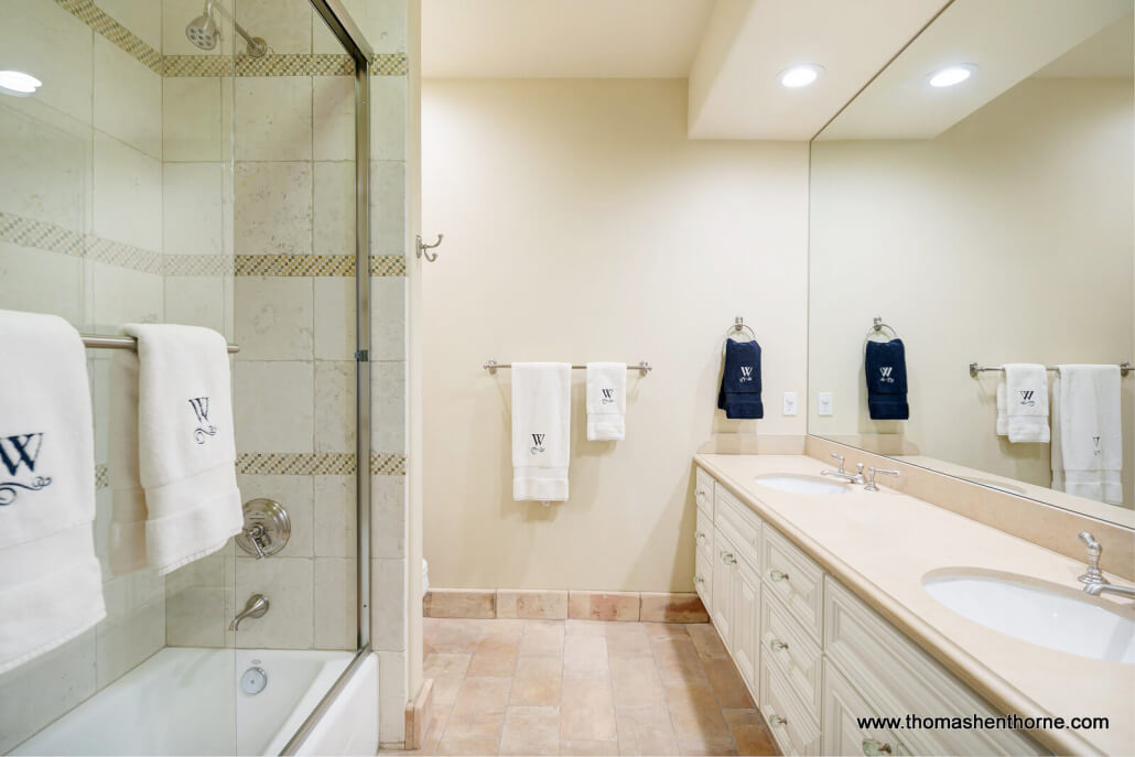 There is also a large guest bedroom with an ensuite bathroom located on the main level. This room could also serve as the perfect home office. The ensuite bath features a custom tile, walk-in glass shower with a built-in stone bench.
