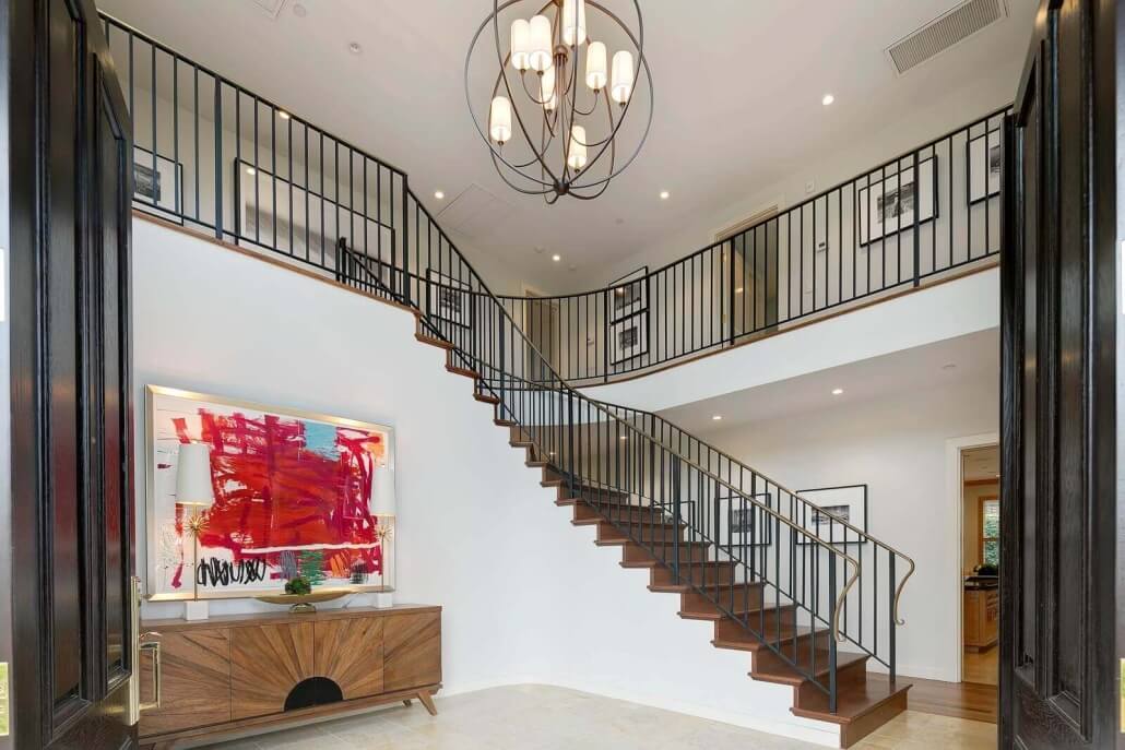 Situated at the end of a quiet cul-de-sac, the estate features a gated, stamped-cement driveway with ample guest parking and a three-car garage. Stone steps lead to an impressive double-door entry into the grand foyer, with marble floors, soaring ceilings and a custom curved staircase.