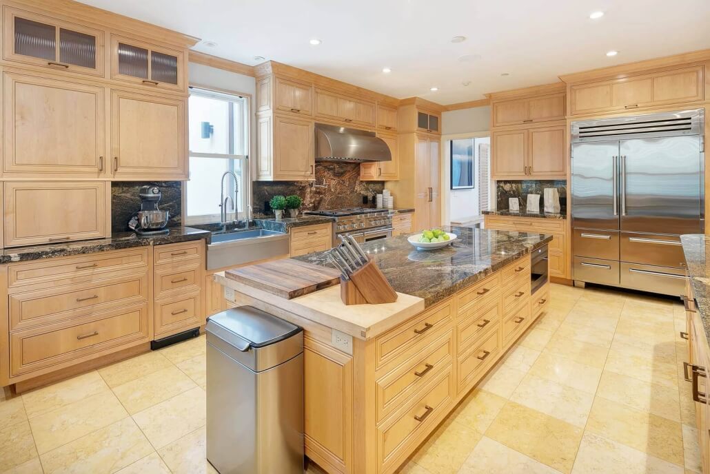 The chef’s kitchen features a double Wolf range, large Subzero refrigerator, Wolf drawer microwave, two sinks, granite countertops and backsplash, custom cabinetry, a large center island and a built-in banquette for informal dining