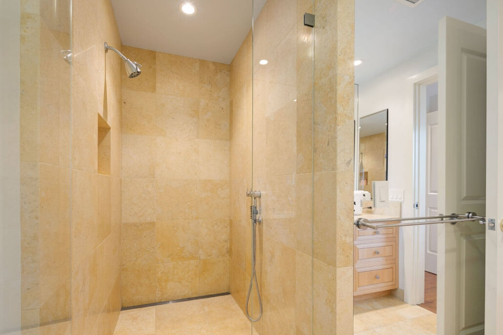 The office/optional fifth bedroom is located on the main level and features an ensuite bath, extensive built-in cabinetry and stone-topped workspace and sliding doors which open onto a private view patio.