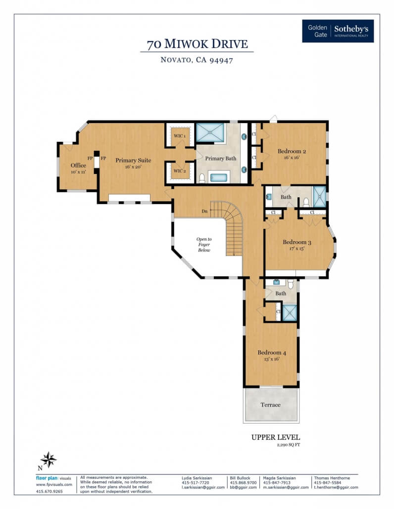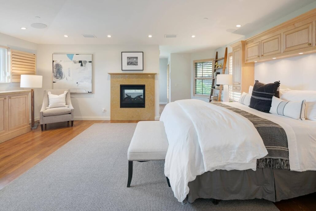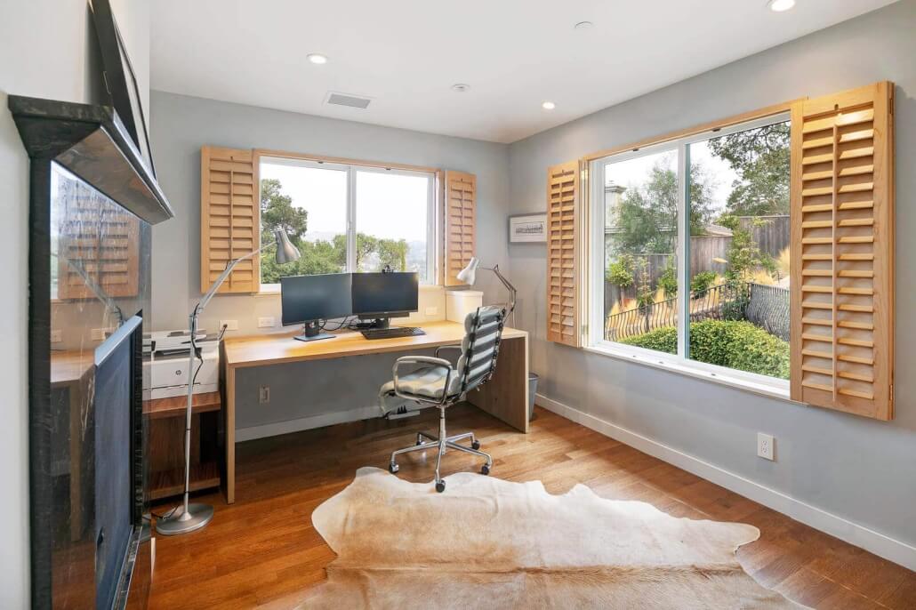 The spacious primary suite is located on the second level and features custom cabinetry, a two-way gas fireplace, two large walk-in closets and stunning views of the nearby hills. The primary bath is worthy of a boutique spa and features a jetted soaking tub, an extra-large shower with glass surround and custom cabinetry with dual vanities. The primary suite also features an office with panoramic views that opens out to the upper patio and garden area.