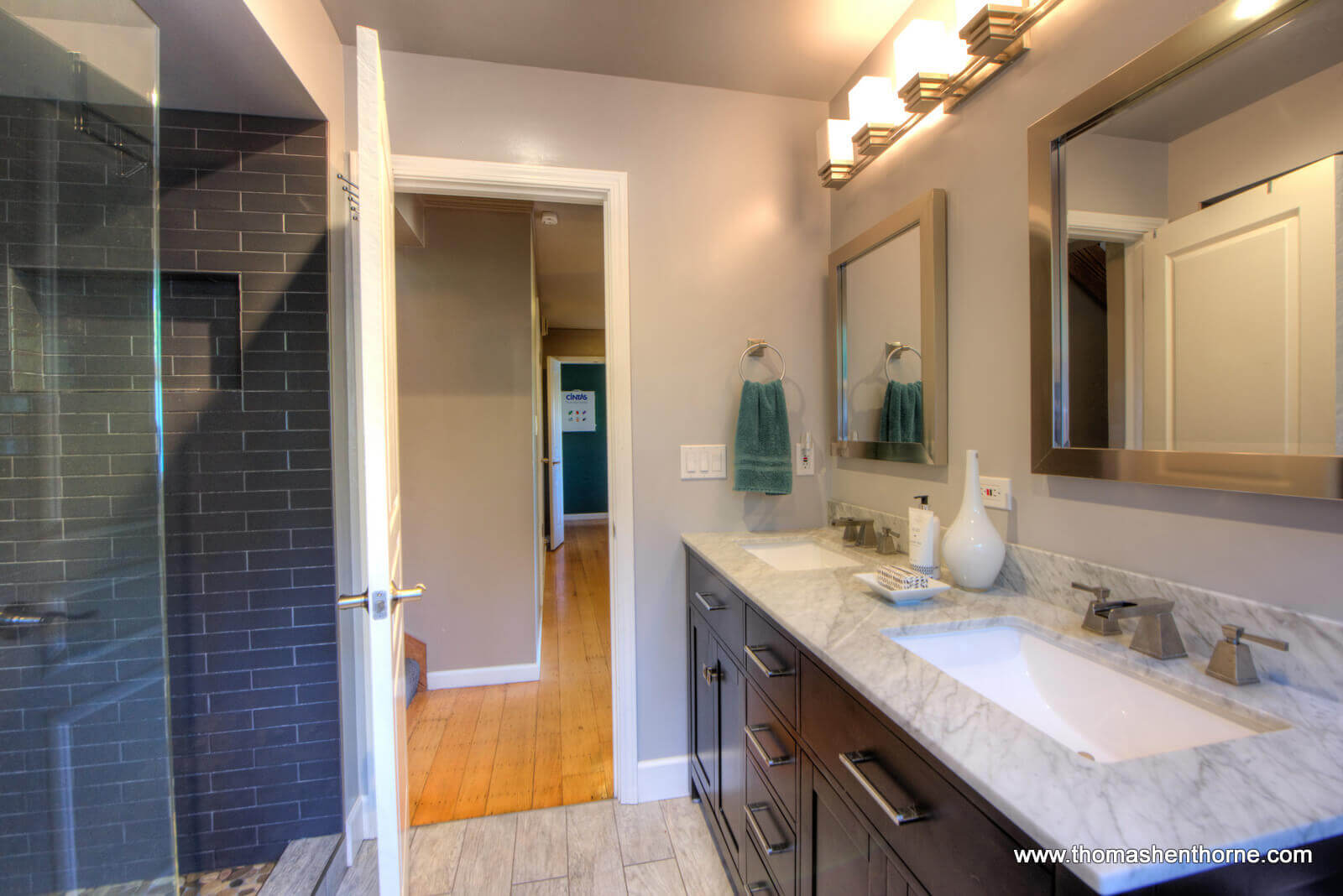 The remodeled kitchen opens to the dining / living areas and boasts stainless appliances, white cabinetry and ample counter space. The dining area opens out to an inviting and private outdoor living area perfect for entertaining and dining al fresco. The light-filled master bedroom is also located on the main floor and features a newly remodeled master bath with custom tile work, a large walk-in shower and dual sinks.