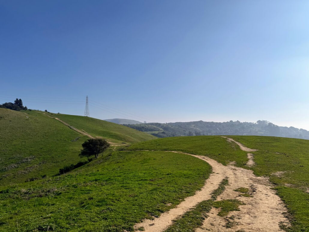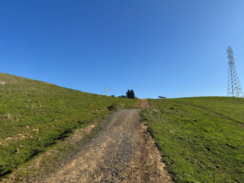 - The Main Junction: Hike up to the top and turn right on the fire road. This is the “Main Junction” you will circle back to in Step 16. You may start seeing horses at this point—remember to stay at least 20 feet away from them. You’ll see electric lines and towers on your right as you ascend. You are here now.