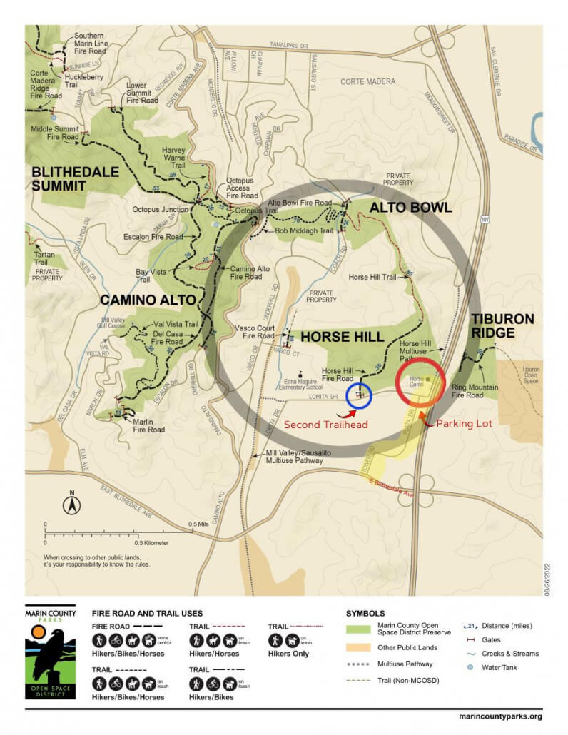 This hike is easily accessible from Mill Valley and is just 5 minutes from the freeway. From Hwy 101, take the Tiburon Blvd / E Blithedale Ave exit and head west on E Blithedale towards Mill Valley. Turn right on Tower Drive (near the Redwoods), right on Plaza Drive, and follow Plaza up to Lomita Drive. To get to the barn and parking lot, turn right on Lomita and follow it to where it ends at the parking lot and stable (right next to 101).
