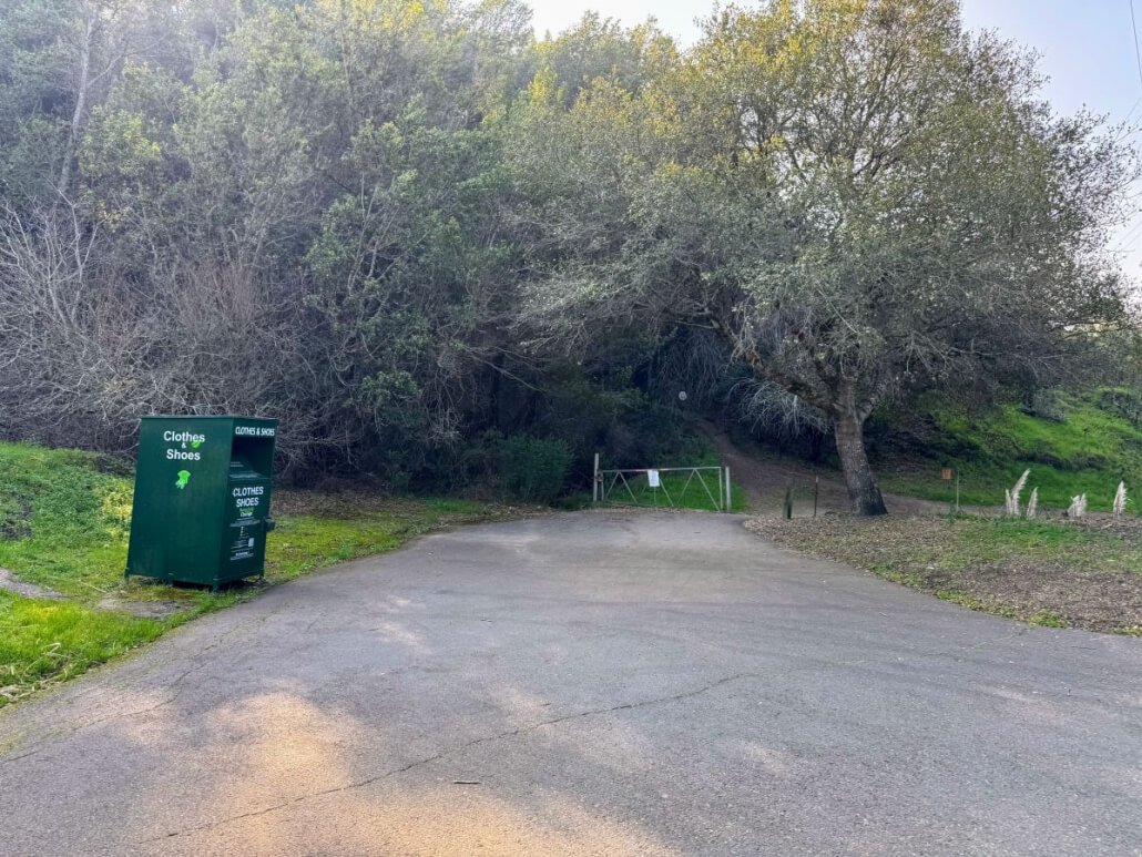- The Tennis Courts: Pass the tennis courts (you’ll see restrooms on the left) and go through the trailhead gate. You’ll see a clothing donation box on the left that has been there for a long time. Go left just after the gate and head up the hill (ignore the trail to the right). You are here right now.