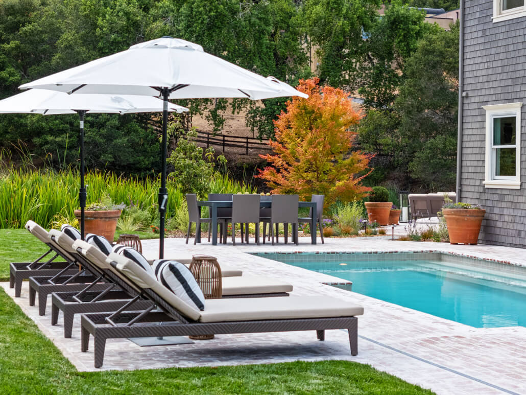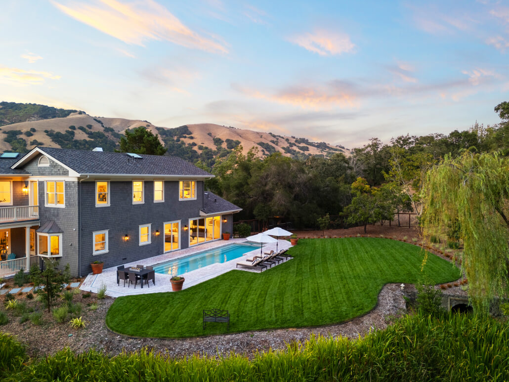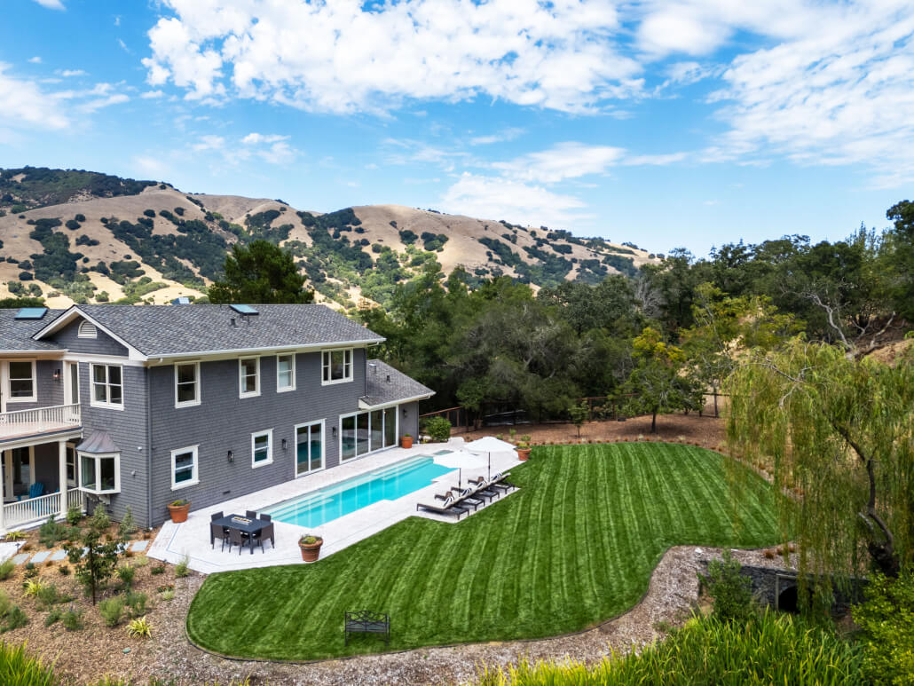 A sprawling lush lawn and sparkling swimming pool evoke the ambiance of a private resort, creating an ideal backdrop for both quiet mornings and lively gatherings. From sunrise coffee on the upper balcony to sunset cocktails at the water’s edge, every moment outdoors is framed by the cinematic ridgelines of Lucas Valley.
