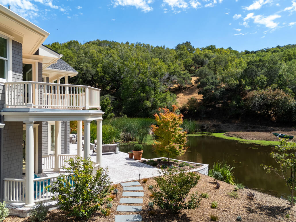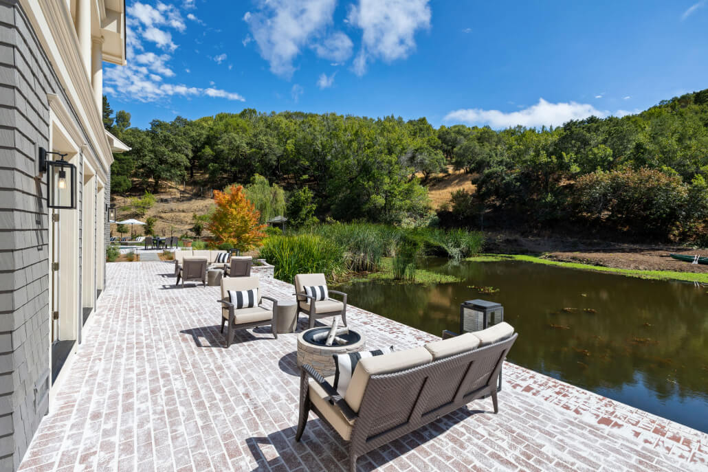 The entire first level of the home opens to an extraordinary outdoor oasis—completely private, distinctive, and of a scale and beauty rarely found in Marin County. A spacious rear brick terrace invites alfresco dining beside the serene private pond, evoking a Monet painting with its water iris, cattails, and graceful ducks gliding across the surface. As evening falls, the gentle chorus of crickets and frogs provides a tranquil serenade to the setting sun.