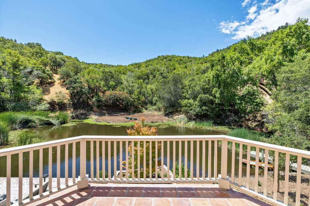 Upstairs, the primary suite serves as a private sanctuary with vaulted ceilings, a cozy fireplace, and postcard-worthy views of the tranquil pond and rolling Lucas Valley hills. A secluded terrace extends the retreat outdoors—ideal for morning coffee or quiet sunset moments.