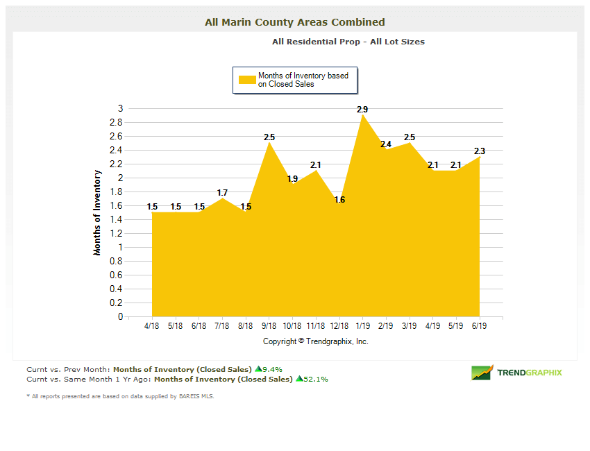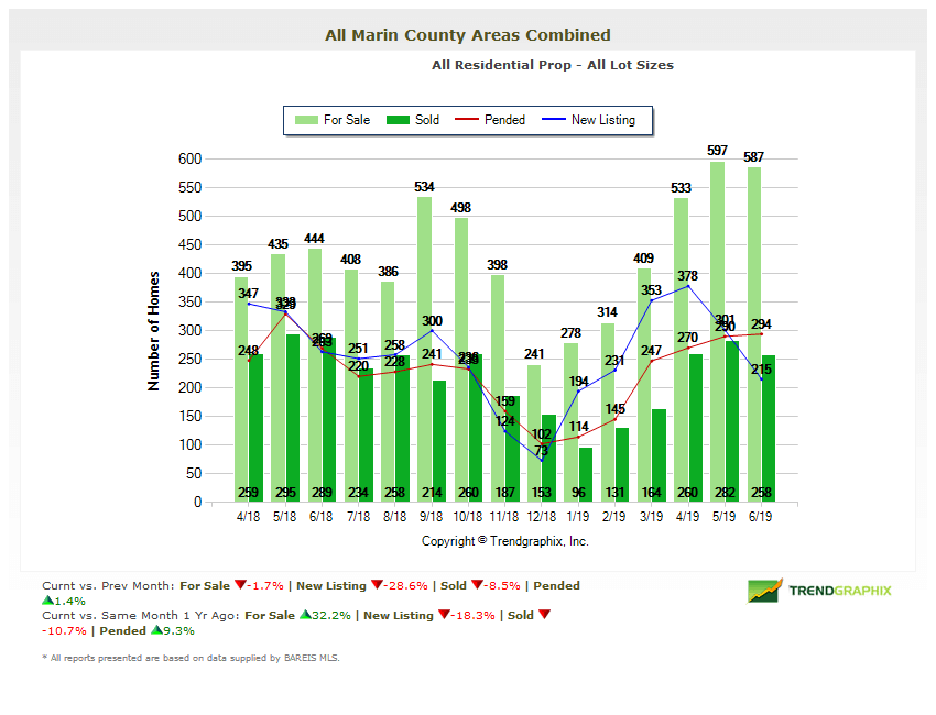 The June Marin real estate market numbers are in and we continue to see higher inventory and flattening prices compared to last year at the same time. The number of homes on the market was up 32% compared to June 2018 while median pricing was down about 3%.