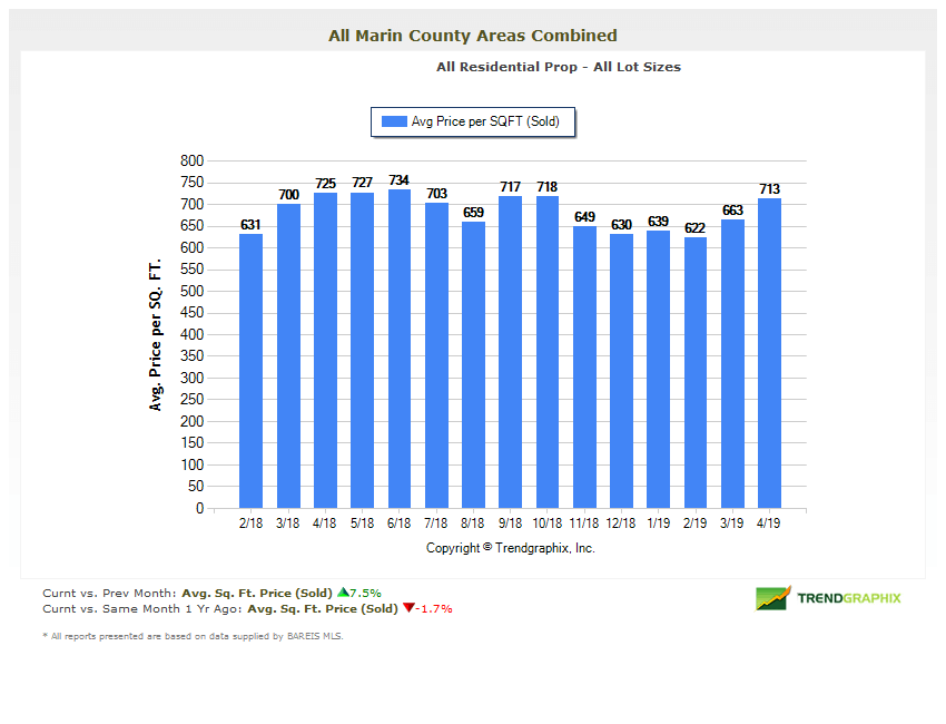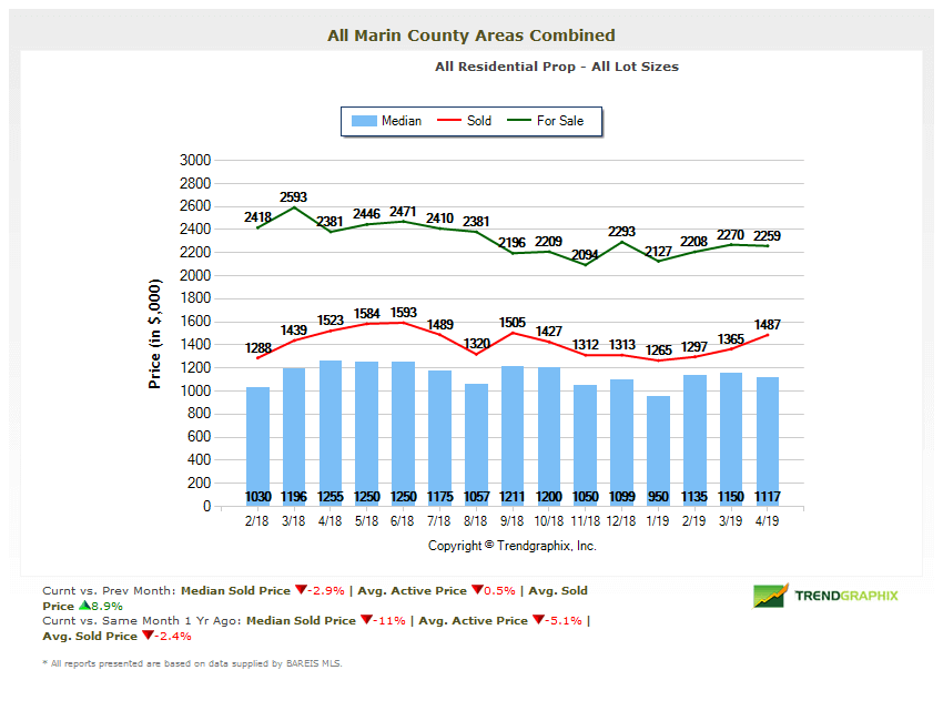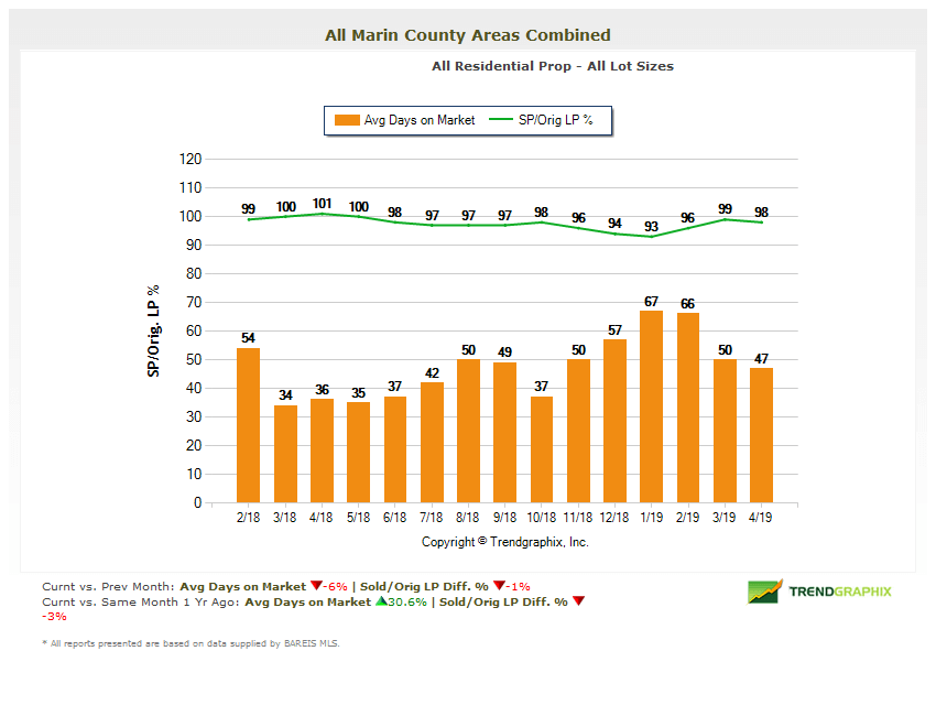 I have also included the Q1-2019 charts from Golden Gate Sotheby’s International Realty below, and for the full quarter we saw median pricing down 5.5% in Marin County with the number of sales up about 4% versus the same period in 2018. We also saw days on market increase by about 20%.
