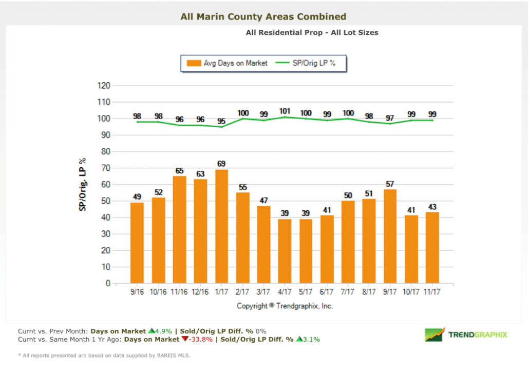 There is much speculation that the tragic fires to our north, which destroyed thousands of homes, is fueling increased demand here in Marin County. At this point there’s only anecdotal evidence pointing to that, but what we are definitely seeing is buyers are more concerned about lining up tradespeople to effect repairs and remodels. Now more than ever, homes in “move in condition” are commanding a premium. I expect that trend to continue in next year’s busy spring season.