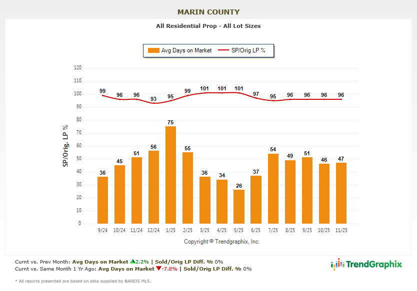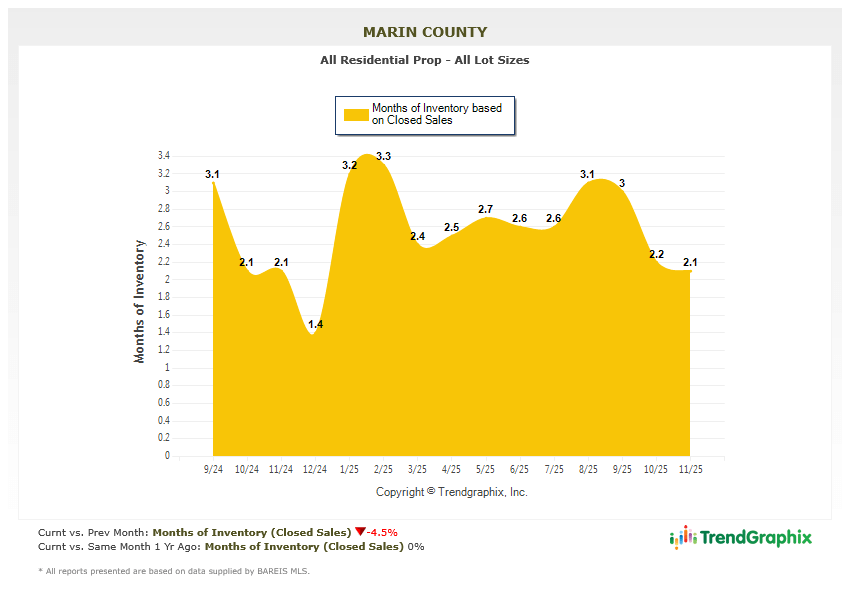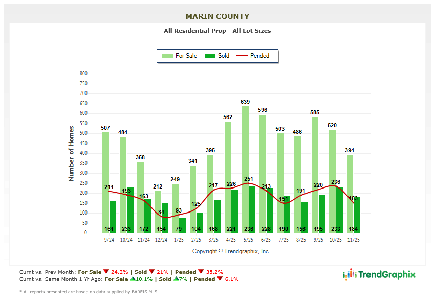 As we head into December and the heart of the holiday season, Marin’s market is doing what it typically does this time of year: fewer new transactions begin, but well-positioned homes still sell, and the underlying fundamentals remain intact. The story in November is that pricing continues to hold even as inventories increase. This is a market that looks more balanced than the last few years, with buyers being selective and sellers needing to be sharper on preparation and positioning.