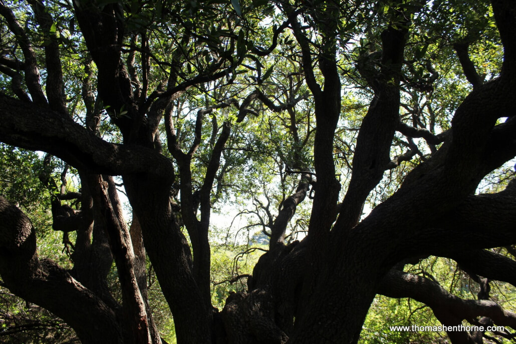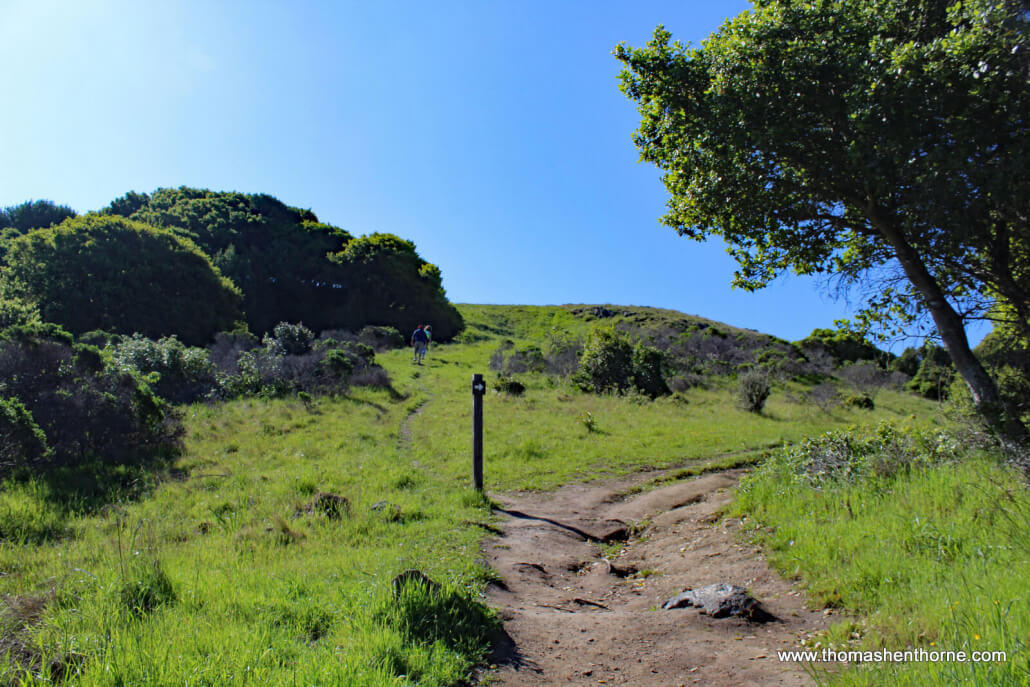 The trail continues to climb through meadows and some clusters of California Live Oaks and California Bay Laurel trees. The first twenty minutes of the trail feature large clusters of poison oak, some of which protrudes into the trail.
